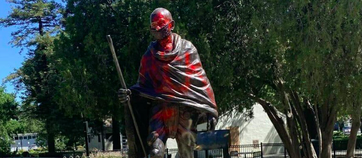 Davis, CA: June 27, 2020 — From the Netherlands to California and London to Washington, DC, statues of Mohandas Gandhi are being defaced with spray-painted accusations of “racist” and “rapist” in the wake of the Black Lives Matter protests which were sparked by the May 2020 murder of George Floyd.